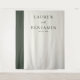 This elegant wedding backdrop features a minimalist design with clean, sophisticated typography that exudes timeless charm. The color palette combines soft cream and muted olive green for a serene and modern look, perfect for creating an intimate and stylish atmosphere at your special event. Ideal for couples seeking a chic yet understated aesthetic, this backdrop is customizable to fit various themes and settings, ensuring it complements any decor choice seamlessly.