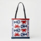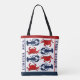 Red, white and blue, lobsters and crabs pattern cloth tote bag. Bold blue wording down the edges on both sides can be changed or removed. Perfect take along to a 4th of July party or any summer get-together. "Lobster feast", "Blue crab boil" "lobster roll" and "crab bisque" is the sample wording.