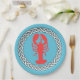 Lovely lobster design is perfect for your lobster or seafood themed kitchen and for your lobster and seafood dinner. Design features a red lobster inside of a circle braided rope border in black and white. The background is a pretty ocean blue colour.