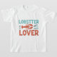 The t-shirt design features the text "Lobster Lover" in a playful, handwritten font, surrounded by colourful, whimsical lobster-themed illustrations like bubbles, seaweed, and seashells. The overall design conveys a sense of fun and joy, celebrating the love of lobster and the ocean.