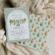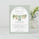 A locally grown themed baby shower invitation that features a watercolor clothes line graphic that features baby clothes and a variety of vegetables and greenery. It has a sage green gingham background and is accented with a modern font. This stylish invitation is easy to edit and is perfect for a gender neutral farmer's market themed baby shower. Pair with anything from the MILLIE collection for a cohesive look.
