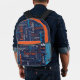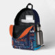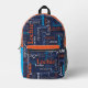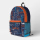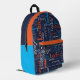 Typographic short name text mid blue, grey, cyan blue, orange and white on a dark blue background custom boy backpack. Background colour can be changed if required currently dark blue. Fun personalized graphic text personalized backpack, ideal for, school, college, school camp or trips out. Personalize with your own short name, currently reads Lochie for help with personalization and other name lengths please contact me. © Design by Sarah Trett for www.mylittleeden.com