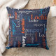 Typographic short name text mid blue, grey, cyan blue, orange and white on a dark blue background custom cushion pillow design. Background colour can be changed if required. Fun personalized graphic text personalized cushion. Ideal for the car, camping for winter nights or trips out. Personalize with your own short name, currently reads Lochie for help with personalization and other name lengths please contact me. © Art and design by Sarah Trett for www.mylittleeden.com
