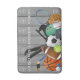 Locker Room Design Bath Mat, featuring a pile of various sports' equipment in front of a set of lockers, with customizable text. For no text, delete sample text and leave blank.