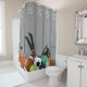Locker Room Design Douche rideau, avec une pile d'équipement sportif devant un ensemble de casiers.