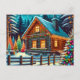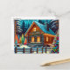 Personalized Christmas postcard. A beautiful illuminated log cabin on Christmas Eve with Christmas lights and snow topped trees. As the snow falls on this magical night, I wish you everything merry and bright. A sweet personalized holiday postcard to give you a warm and cozy vibe.