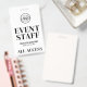 At the top, there’s a space to add your company name or logo. Below, "Event Staff" is displayed in a bold serif font, paired with simple typography for the event name, date, and "All Access Pass."