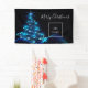A trendy and modern Christmas banner for your company, business in black, blue and white. A black background with a shining glittery blue Christmas tree decorated wiht stars. With the text: Merry Christmas written with modern and trendy large white hand lettered style script. Templates for your company, business logo.