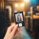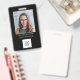 badge photo de l'employé avec logo de l'entreprise sur le devant et code qr sur le dos. Facile à modifier le texte. Style moderne et simple. Texte blanc sur arrière - plan noir.