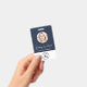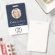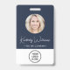 Modern professional blue ID badge featuring your employee's photo in a circle frame, their name in a chic white script and their title in simple white lettering, and your business logo. On the back, add any additional information and optional QR and bar codes.