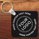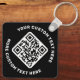 Double sided keychain with your custom logo surrounded by circular text on the front and QR code on the back on a black or custom colour background. Change fonts and colours, move and resize elements with the design tool.