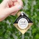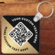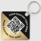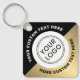 Double sided keychain with your custom logo on a white, round background surrounded by circular text on the front and QR code on the back. Black and golden gradient (printed image) background. Change fonts and font colours, move and resize elements with the design tool.