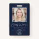 Professional blue ID badge featuring your employee's photo, their name in a chic white script and their title in simple white lettering, and your business or organization's logo. On the back, add additional information and optional QR code.