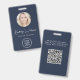 Professional blue ID badge featuring your employee's photo in a circle frame, their name in a chic white script, their title in clean white lettering, and your business or organization's logo. On the back, add any additional information and an optional QR code. The QR code is automatically generated by Zazzle from the website address you provide.