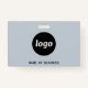 Simple logo with custom text and QR code professional business name badge. Change the logo, QR code website destination and any of the text to customize. The back features your logo and company name.