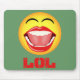 Smiling Face © Sunny Mars Designs. This cool, humourous, fun, mouse pad or mouse mat features a funny illustration of a yellow laughing face emoticon with an open big mouth, bright white pearly teeth, tongue and closed eyes, with the acronym "LOL" below which stands for Laughing Out Loud below it. Concept for humour.
