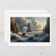 A majestic London bridge towers over a tumultuous sea, with large waves crashing against rocky cliffs under a dramatic sky. The atmosphere is filled with a sense of awe and power as sunlight breaks through the clouds.