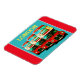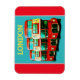 Fridge magnet with horizontal design showing a photo digitally treated of the former style of London buses, duplicated three time on a background of red and teal. A great souvenir of London to take home or to put in your kitchn.