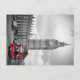 A card of big ben and an iconic red double decker bus in London England.