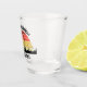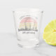 Personalized London vacation shot glass with a silhouette of the city attractions in front of a cool sunset including the bridge, the London Eye (Millenium Wheel), and the Big Ben clock. Cool United Kingdom trip keepsake souvenir.