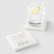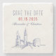 Simple, modern, elegant London wedding save the date invitation coaster with unique art drawing in blue and red colour combination.