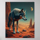 Lone Wolf in Desert of mars space- A lone wolf stands on a red desert landscape, its fur a mix of grey and white, with a hint of brown. The wolf's eyes are a piercing yellow, and it stares intently towards the outlook. The background features a endless, rugged desert with tall, thin rock formations rising from the sand. A semi circle moon hangs in the dark blue types sky, dotted with stars.