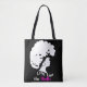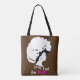 Profile icon illustration of a female with full-blown kinky Afro on large tote bag; black background on one side, brown background on the other side.