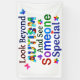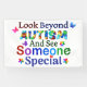 Inspirational quote of “Look Beyond AUTISM And See Someone Special” with colourful Autism puzzles to support autistic children and their families.