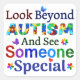 Inspirational quote of “Look Beyond AUTISM And See Someone Special” with colourful Autism puzzles to support autistic children and their families.