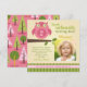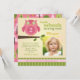 Invite guests to your little one's second birthday with this adorable pink owl photo invitation featuring "Look Whoo's Turning Two!" in playful pink and olive green. A sweet illustrated owl perches on a branch beside a framed space for your child's photo, with pink and green striped accents along the bottom. The back features a charming pattern of colourful woodland trees in coordinating pink, green, and brown tones. All text is fully customizable to match your celebration details.