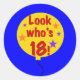 A yellow balloon, confetti stars, and text that reads "Look Who's 18!" on a blue background on 18th birthday cards, buttons, and more!