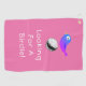 "Looking For A Birdie" with colourful bird, golf ball art and white text. Personalize this Golf Towel with your message and laugh your way around the links. Comes in several colours. Golf ball and bird art can be removed or placed in another location on the design. Pink background.