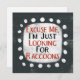 An irreverent typographic animal design that says "Excuse Me, I'm Just Looking For Raccoons". It features black and red text on a white rectangle with funky, playful white dots surrounding it, all on a grey background.