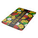 Black bathroom bathmat patterned with red, yellow and white tropical hibiscus flowers and green palm leaves. Across the middle is the quote 'LOOKING GOOD' which is customisable so you can add your own wording, or delete if you prefer