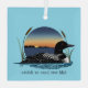 A loon on a lake with a sunset and cattails in a backdrop of blue