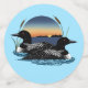 A pair of loons on the lake with a warm sunset behind them, all set against a blue backdrop