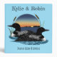 A pair of loons on the lake with a warm sunset behind them, all set against a blue backdrop