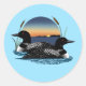 A pair of loons on the lake with a warm sunset behind them, all set against a blue backdrop