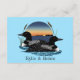 A pair of loons on the lake with a warm sunset behind them, all set against a blue backdrop