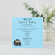 A pair of loons on the lake with a warm sunset behind them, all set against a blue backdrop