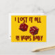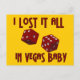 Postcard proclaiming "I lost it All in Vegas Baby" with 2 red die as the centerpiece on a golden yellow background. The background colour can be changed.
