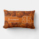This cool lumbar pillow for a basketball player features varied size basketballs turned every which way on a basketball-orange background and prominent jersey number overlying a chunky, full length colour strip (same colour as background), upon which you can also customize the athlete's name in white - reverse side of pillow features a larger version of the basketballs pattern - by katz_d_zynes - similarly styled hand towels for basketball players can be found in katz_d_zynes' Team spirit basketball towels & water bottles collection >>>>>> https://www.zazzle.com/collections/119294281025204192