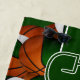 This sports themed beach towel for basketball players features a bunch of varied size basketballs that have green & white panels turned every which way on a green background - personalize with the athlete's name & jersey number plus team name & mascot name - by katz_d_zynes