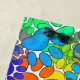 Colourful pattern of dog paw prints in many sizes, angles and colours.