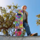 Colourful pattern of dog paw prints in many sizes, angles and colours.