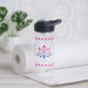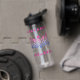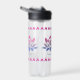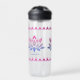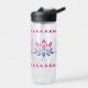 This practical and pretty floral water bottle has three blue-pink coloured lotus flowers with editable text to promote a calm meditative drinks break. The three items of text for you to edit and customize are: "THANKFUL" "HAPPY" and "JOYFUL". Around the top is a simple pattern echoing the bright pink petal of the lotus flower. This is repeated around the bottom.