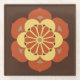 Japanese mandala design glass coaster that depicts a stylized lotus flower, symbolizing purity, spiritual awakening and faithfulness - flower in rust orange / terracotta and golden yellow, accented with tan, on a dark chocolate brown background
