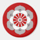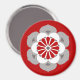 Japanese mandala design round magnet that depicts a stylized lotus flower, symbolizing purity, spiritual awakening and faithfulness - flower in silver gray / grey, red and white, on a dark Chinese red background