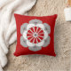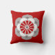 Japanese mandala design throw pillow that depicts a stylized lotus flower, symbolizing purity, spiritual awakening and faithfulness - flower in silver grey / grey, red and white, on a dark Chinese red background