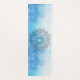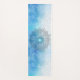 A black, drawn out lotus mandala with an illuminating blue centre on a white and blue speckled, ombre backdrop. Hypnotic zen.